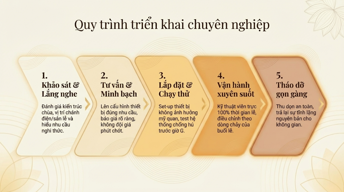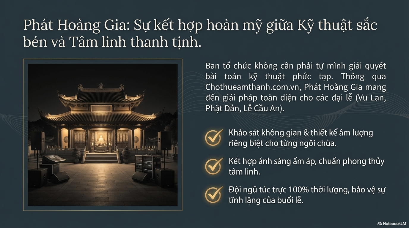 Trong thực tế, để đảm bảo cả yếu tố kỹ thuật lẫn sự hài hòa về không gian tâm linh, nhiều ban tổ chức đã tin tưởng lựa chọn Phát Hoàng Gia - Chothueamthanh.com.vn. Với kinh nghiệm triển khai âm thanh – ánh sáng cho các sự kiện mang tính trang nghiêm, đơn vị này chú trọng từ cách bố trí loa, micro đến thiết kế ánh sáng phù hợp với không gian chùa, giúp buổi lễ diễn ra trọn vẹn, thanh tịnh và đúng chuẩn nghi lễ.