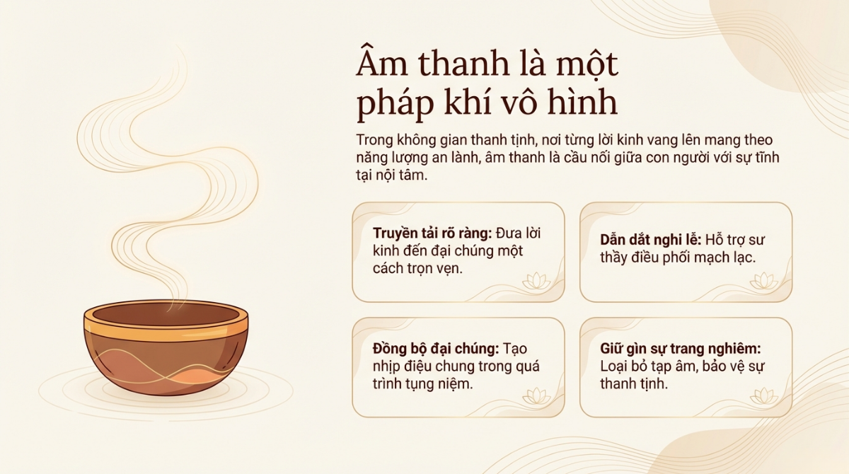 Trong các nghi lễ Phật giáo như cầu an, cầu siêu hay tụng kinh, âm thanh đóng vai trò như một “pháp khí vô hình”.