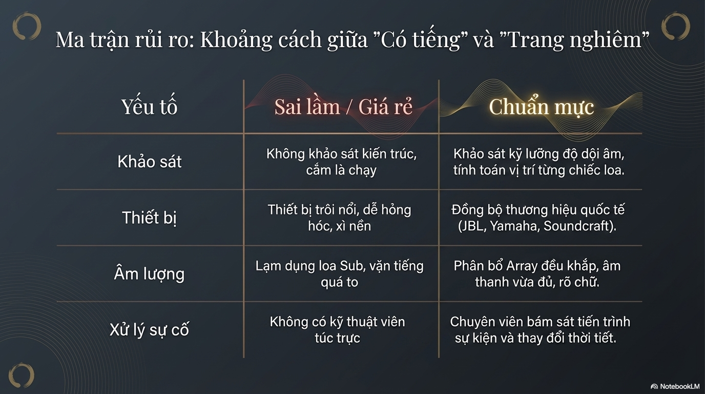 Một hệ thống âm thanh kém chất lượng có thể gây nhiễu, hú, rè, khiến người tham dự khó tập trung. Nói một cách nhẹ nhàng, đó là điều “không nên xuất hiện” trong không gian vốn cần sự tĩnh lặng và trang nghiêm.